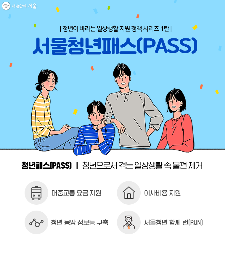 서울시에서는 소득·재산과 상관없이 서울에 사는 19~24세 청년들에게 연간 최대 10만 원의 대중교통 요금을 지원한다. 그리고 청년 1인가구에는 이사비 등으로 1인당 40만 원 상당의 바우처도 지원한다. 서울시에서 추진하는 ‘청년이 바라는 일상생활 지원’ 3대 시리즈 정책 이름은 ‘청년패스(PASS)’ 사업이라고 한다. 앞으로는 몰라서 놓치는 프로그램들은 4월부터 운영될 청년몽땅정보통이라는 싸이트에서 확인할 수 있다. 우선 올해부터 운영되는 청년패스에 대해 알아보자.