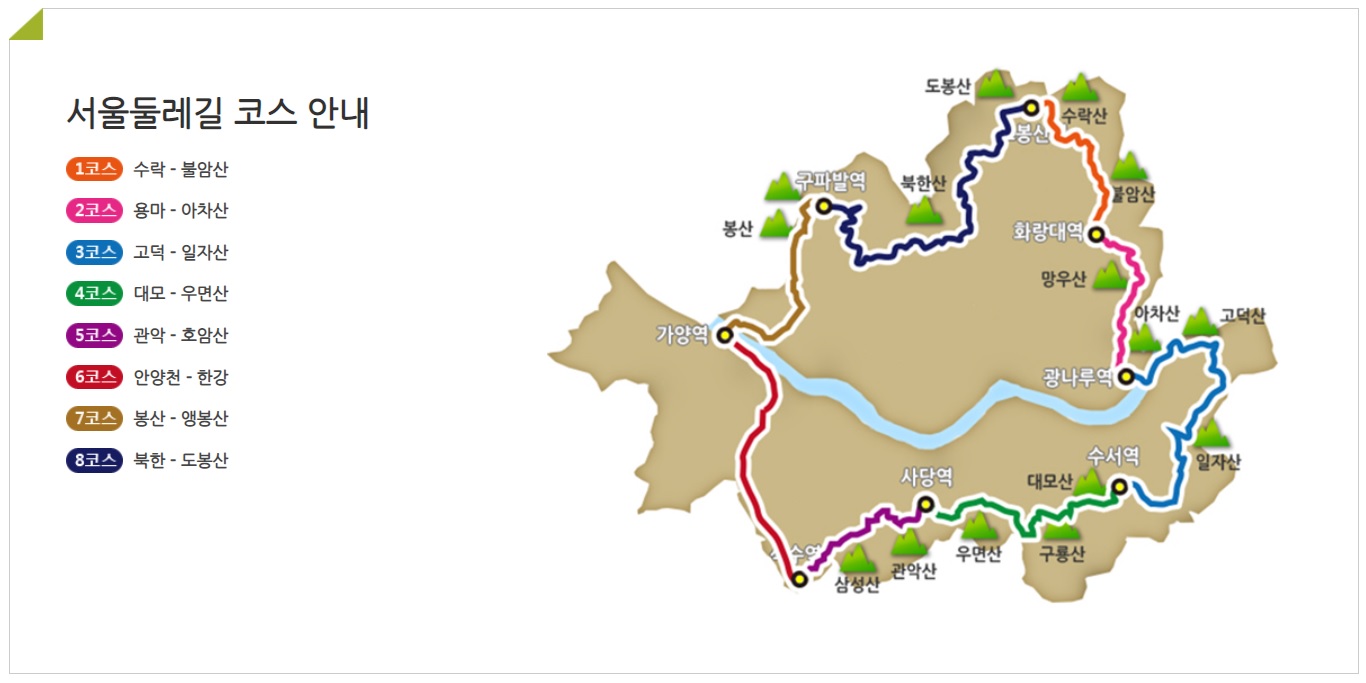 서울의 둘레길은 한 바퀴 휘감는 총 연장 156.5km로 8개 코스로 서울의 역사, 문화, 자연생태 등을 스토리로 엮어 국내외 탐방객들이 느끼고, 배우고, 체험할 수 있도록 조성한 도보길이다. 서울둘레길은 ‘숲길’, ‘하천길’, ‘마을길’로 구성되어 있는데, 둘레길 곳곳에 휴게시설과 북카페, 쉼터를 만들어 시민들이 자연스럽게 휴식을 취할 수 있게 했고, 전통 깊은 사찰과 유적지을 연결해 서울의 역사와 문화, 자연생태를 곳곳에서 체험할 수 있도록 조성해두었다.
