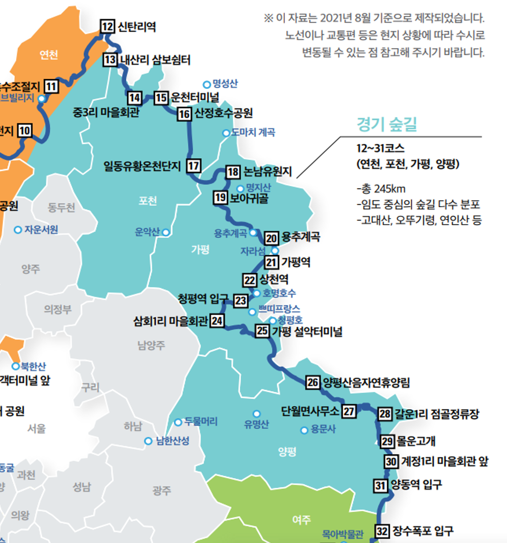 | 가평 25코스 | 가평 설악터미널~신천 2리 노인회관~창말 입구~위곡3리 마을회관 ~마치고개~설곡리 마을회관~양평산음자연휴양림 |