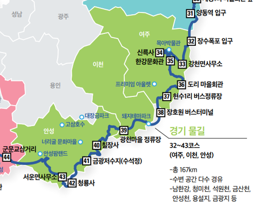 | 이천 38코스 | 장호원 버스터미널~오남사거리~신추교~본죽리 ~안성금산일반산업단지~광천마을 버스정류장 |