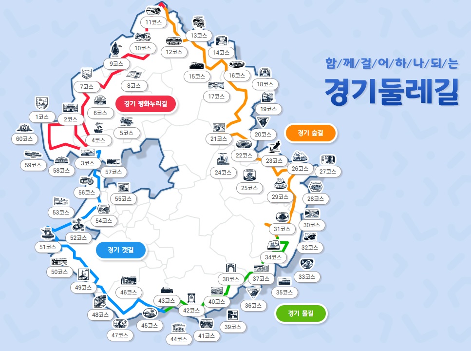 둘레길은 DMZ 외곽 걷기길을 연결한 경기 평화누리길, 푸른 숲과 계곡이 있는 경기 숲길, 강을 따라 너른 들판과 함께 걸을 수 있는 경기 물길, 청정 바다와 갯벌의 매력을 느낄 수 있는 경기 갯길까지 총 60개 코스로 이루어져 있으며 길의 특징을 담아 4개의 권역으로 나눠진다.
