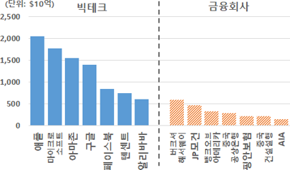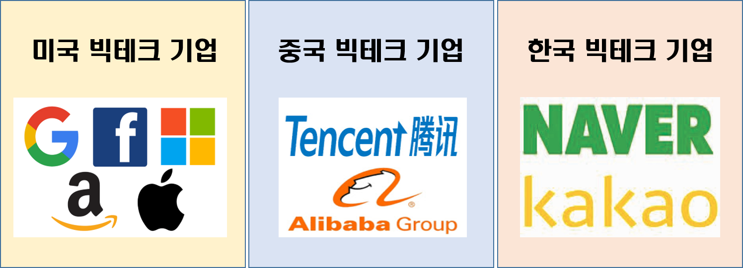 즉 요즘 빅테크(BigTech)는 인공지능, 빅데이터과 같이 첨단 기술 및 플랫폼 혁신을 기반으로 하여 온라인상에서 다양한 서비스를 제공하는 대형 ICT 회사들을 의미한다. 대표적인 미국의 빅테크 회사로는 구글, 아마존, 애플, 페이스북이 있고 중국에는 알리바바, 바이두, 텐센트가 있다. 그리고 한국에서는 네이버, 카카오 등이 빅테크 회사로 알려져 있다.