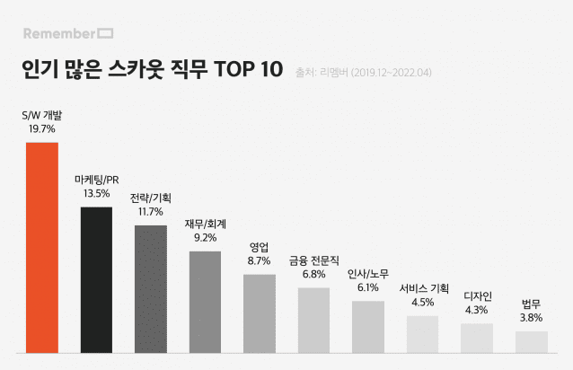 최근 IT업계를 중심으로 임금 인상이 한창 진행 중이다. 뿐만 아니라 귀한 몸 모셔오기 스카웃 제의도 많이 이루어지고 있다. 4차 산업과 함께 급부상한 IT업계에서는 경력 있는 전문가 인재가 매우 귀하기 때문이다. 그래서, 요즘 소프트웨어 개발직들의 스카웃 제안이 높은 편이다. 그 다음이 마케팅 직무로 나타났다.