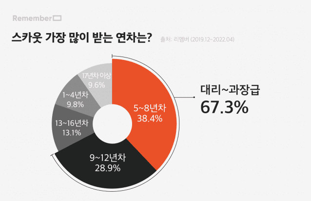 사원급은 아직 경험이 부족한 경우가 많고 부장이나 임원급은 그만큼 대우가 높아야 하기 때문에 스카웃 제의가 상대적으로 많지 않은 것으로 보인다. 요즘 근속 경력이 짧은 사람들이 많은데, 근속 경력이 길어야 스카웃 제안도 쉽게 들어 온다.