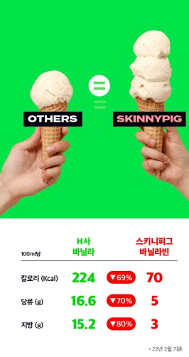 스키니피그는 디저트의 본질을 찾기 위해 시작한 저칼로리 아이스크림 브랜드다. 즐거운 디저트를 먹고나서 후회하거나 죄책감을 느끼며 스트레스 받고 싶지 않다는 생각에서 출발했다. 그래서 800번 이상의 시행착오를 겪어가며 연구한 끝에 칼로리와 당 수치는 가볍지만 달콤함은 그대로 유지한 스키니피그 아이스크림을 만들게 되었다.