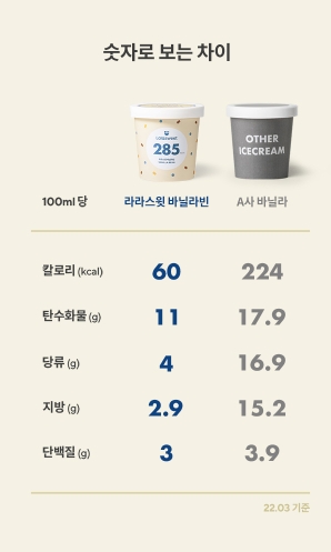 라라스윗의 특징은 원재료를 가득 사용해 깔끔하고 진한 맛을 가지고 있다. 유지방 함량의 3%만 사용하고 저온에서 숙성해 진득하고 묵직한 느낌을 줬다. 아래 사진처럼 칼로리를 크게 줄일 수 있게 스테비아 천연감미료를 사용했다.