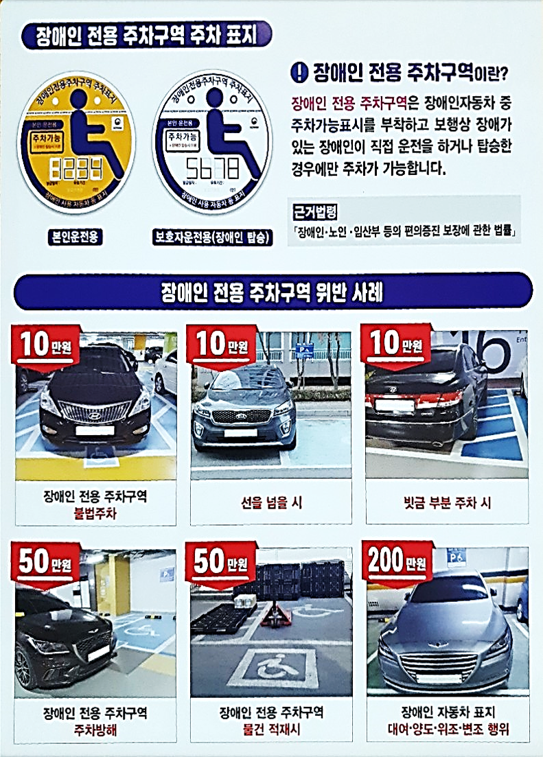 장애인 전용 주차 구역은 장애인 자동차 중 주차가능표시를 부착하고 보행상 장애가 있는 장애인이 직접 운전을 하거나 탑승한 경우에만 주차가 가능하다. 장애인 주차구역에서 규정을 위반 한 경우 기준별로 최고 10만원에서 최대 200만원까지 과태료가 부과 된다.