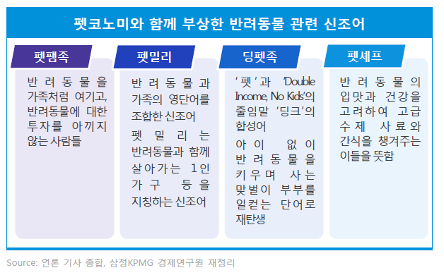 코로나19로 인해 반려동물을 키우는 가정이 증가했고, 같이 보내는 시간이 길어지는 만큼 반려동물을 위한 소비도 늘었다. 또한, 펫코노미와 함께 펫팸족, 펫밀리, 딩펫족, 펫셰프와 같이 반려동물 관련 신조어도 생겨났다.