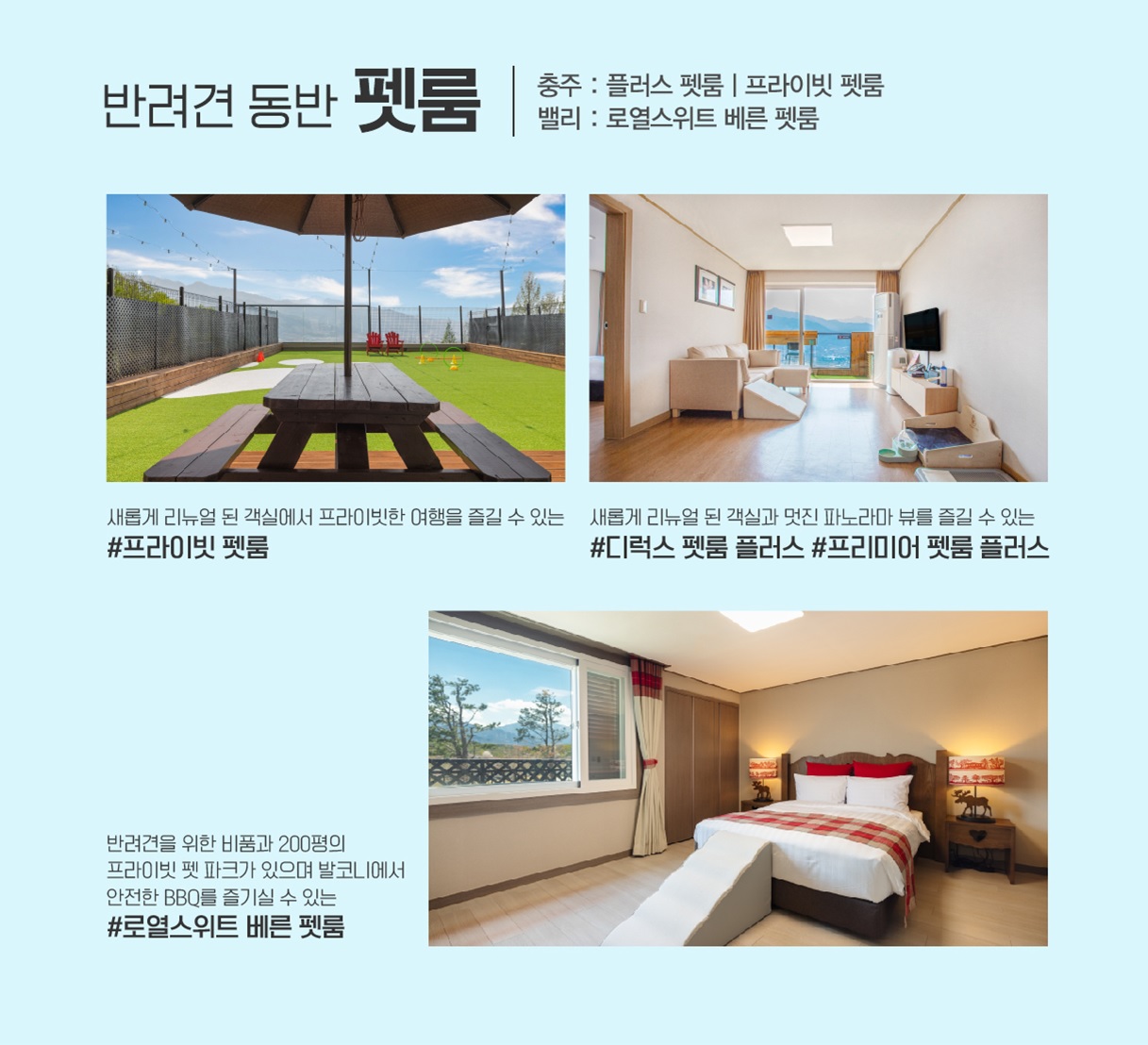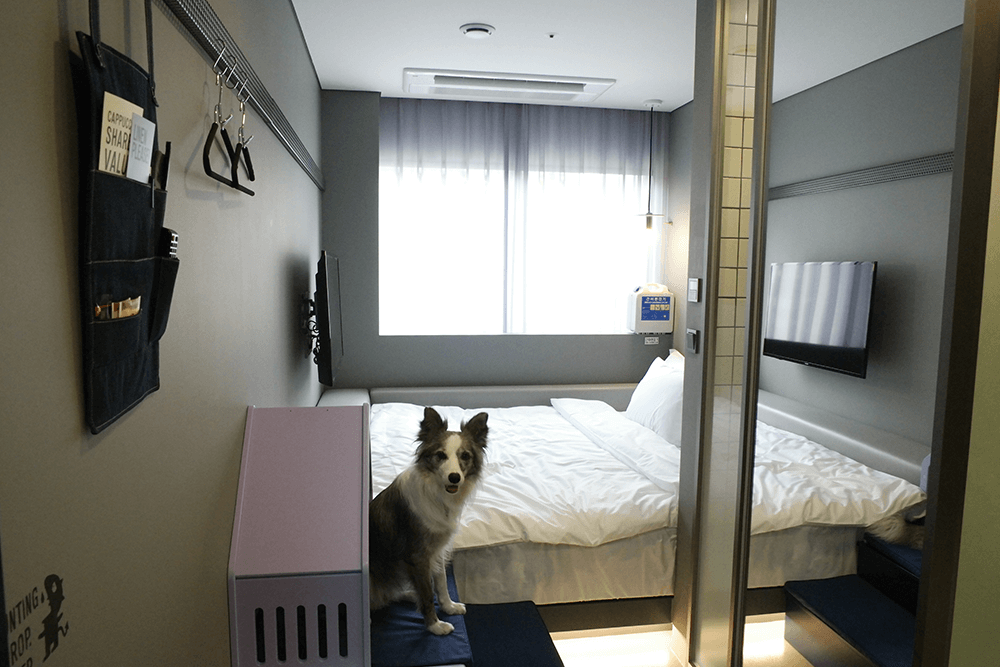 반려동물 동반 객실은 총 44객실이 준비되어 있는데 일반 펫 룸, 테마 펫 룸, 대형견을 위한 빅펫 룸 세 가지 타입으로 준비되어 있다. 뿐만 아니라 객실 내에는 반려동물 전용식기, 배변판, 배변 패드, 미끄럼방지 슬라이드, 먼지 제거기, 공기 청정기 등이 준비 되어 있고 반려동물 전용 타월도 구비되어 있다.
