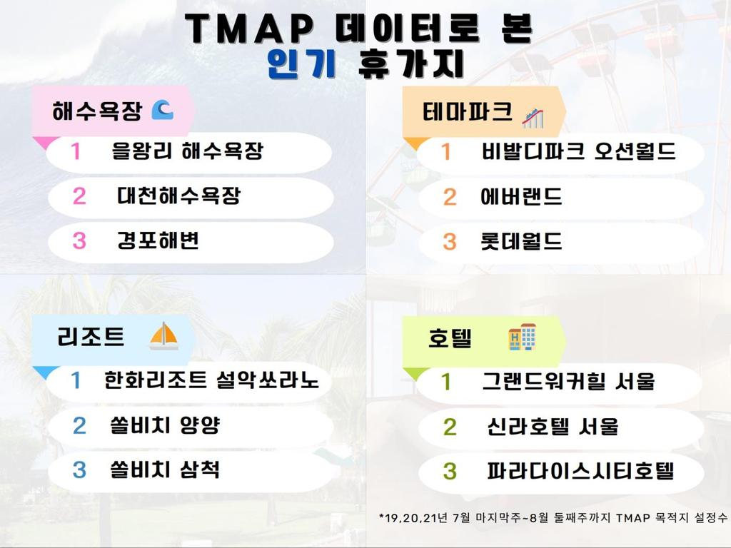 여름철이 되면 많은 사람들이 휴가철을 맞아 여행을 떠난다. 해외로도 많이 가지만 국내 여행도 많이 가는 편이다. 티맵에서는 최근 3년간 여름 휴가지로 가장 많이 간 곳을 선정했다. 어떤 곳을 사람들이 가장 많이 가는지 한 번 알아보자.