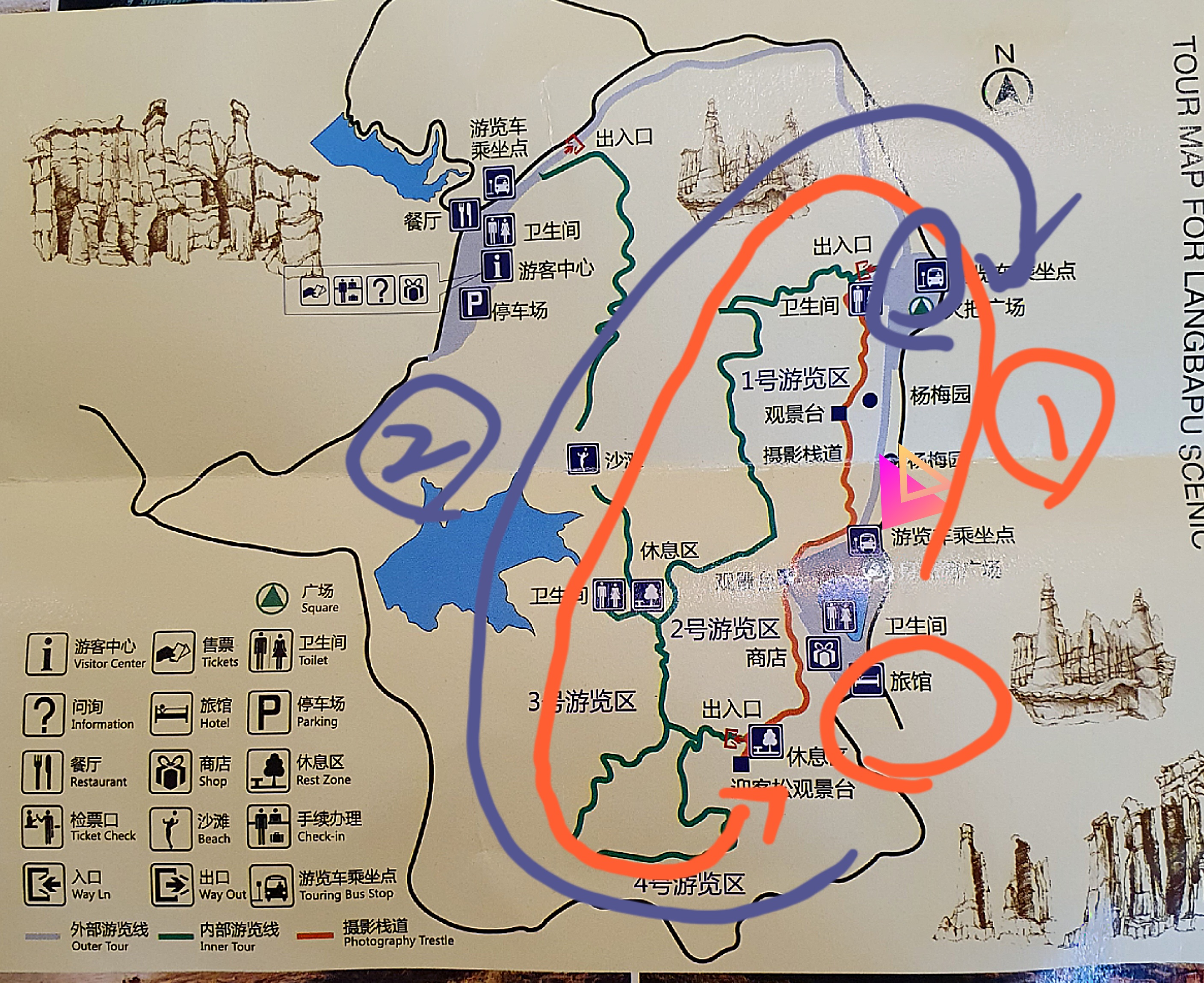 1번 방향은 1번 풍경구부터 시작해서 4번 풍경구로 나오고 2번 방향은 4번 풍경구부터 시작해서 1번 풍경구 쪽으로 나오는 것이다.