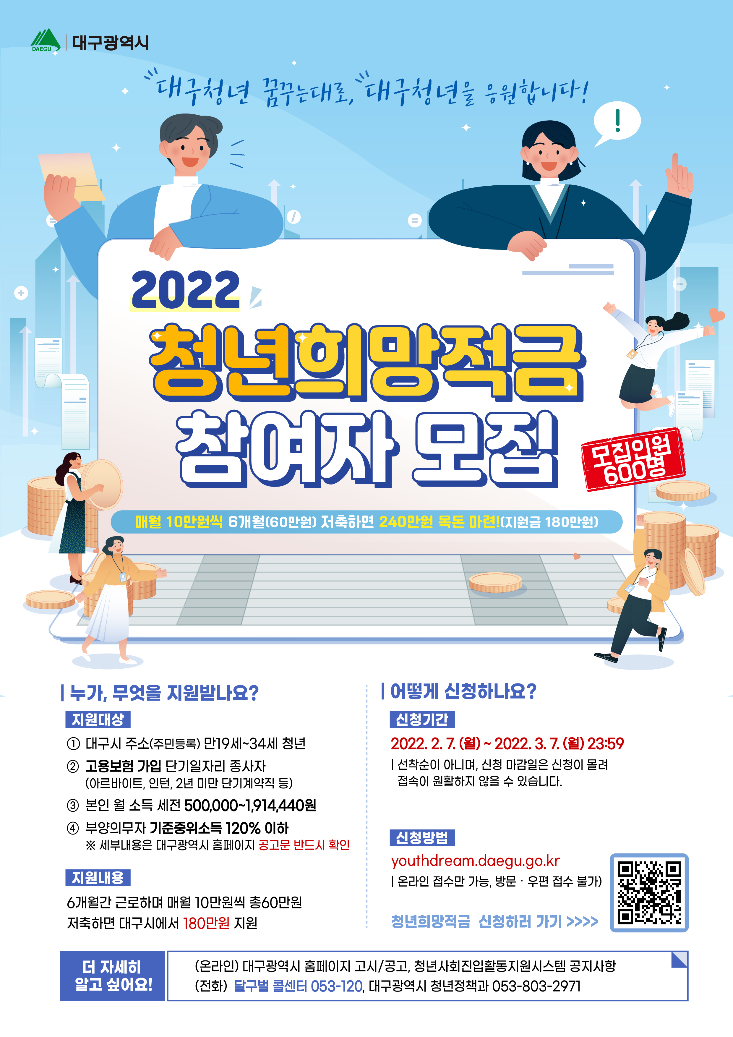 2월 7일부터 3월 7일까지 한 달 동안 신청이 가능한 이 적금은 대구시에서 청년들이 미래를 준비할 수 있도록 지원하는 사업으로 특히 단기근로청년들을 위해 마련했다.