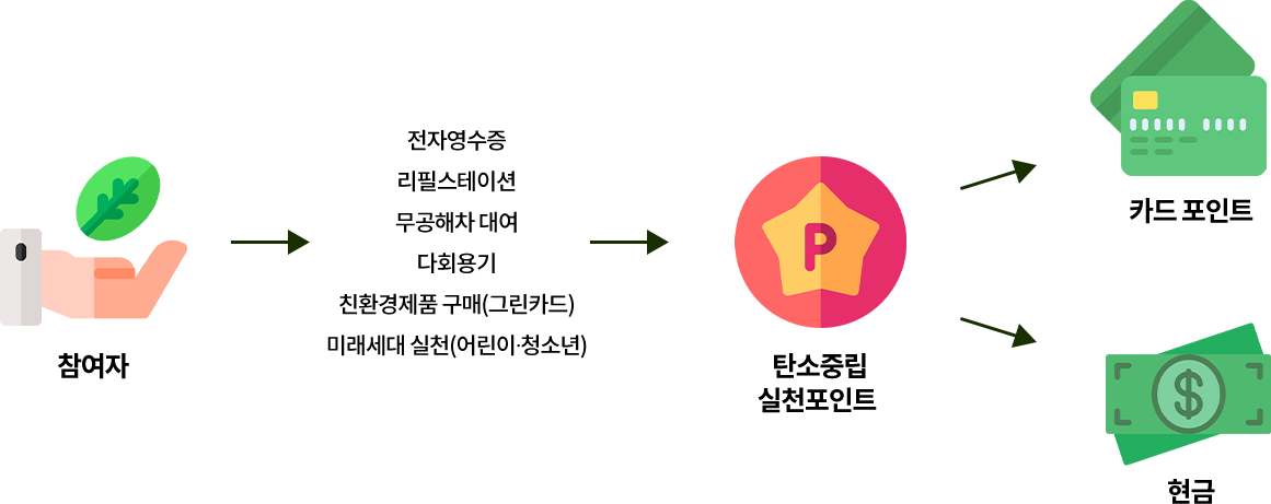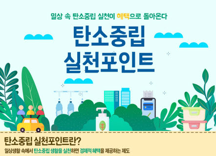 탄소중립 생활실천문화 확산을 위하여 제도로, 생활 속에서 다양한 친환경활동을 하면, 이용실적에 따라 한국환경공단에서 인센티브를 지원해준다. 여기서 인센티브는 계좌나 카드를 통해 현금 또는 포인트로 받을 수 있다. 1인당 최대 7만원까지 지원한다.