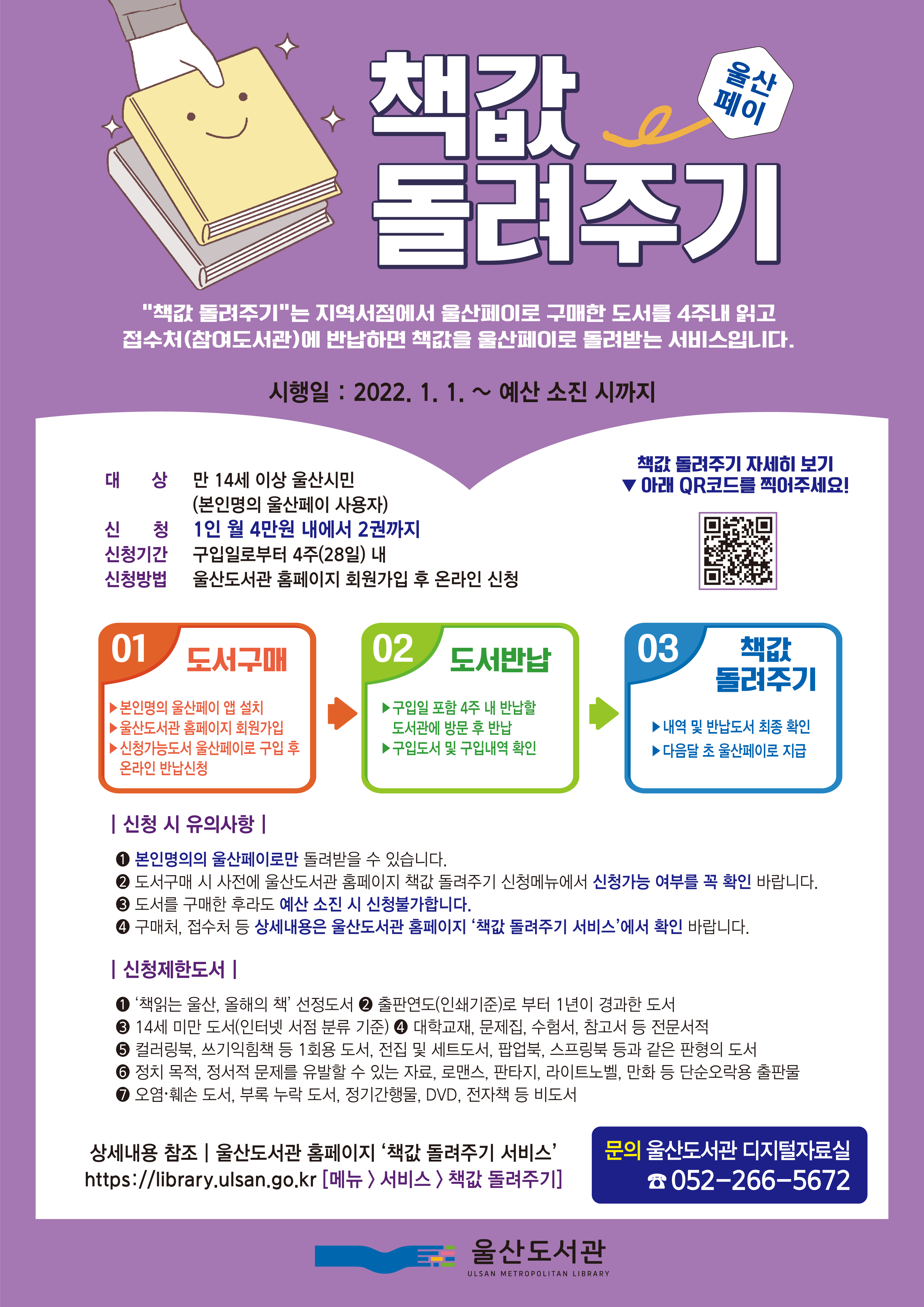 울산도서관에서 2022년 책값 돌려주기 사업을 진행하고 있다. 2021년 1월 5일 이후 시행된 사업으로 울산 내 지역서점에서 울산페이로 구매한 도서를 4주(28일) 까지 읽고, 울산도서관 및 사업 참여 공공도서관(18개소)에 반납하면 익월 초 책값을 울산페이로 돌려주는 서비스다. 자세한 내용은 다음과 같다.