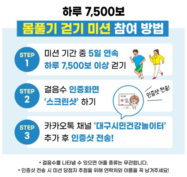 인증 방법은 어떤 어플과 상관 없이 걸음수 인증화면을 스크린 샷을 한 후, 카카오톡 채널 '대구시민건강놀이터' 추가 후 인증샷을 전송하면 된다. 인증샷 전송 시 미션 당첨자 추천을 위해 연락처와 이름을 반드시 남겨야 한다.