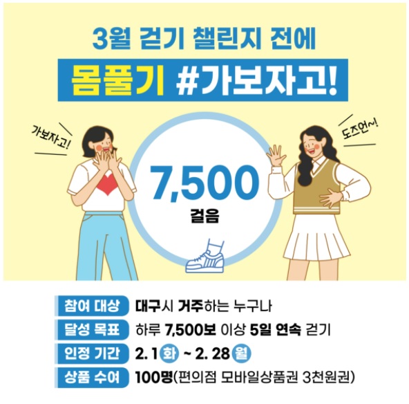 2월 한 달 동안 5일 연속 하루에 7500보씩 걷고 미션 인증 달성 시 100명을 추첨해 편의점 모바일 상품권(3천원권)을 준다.