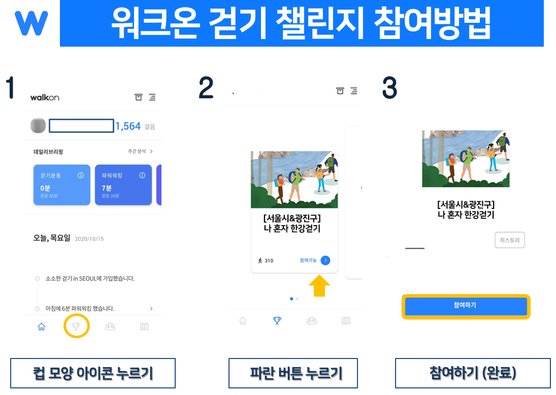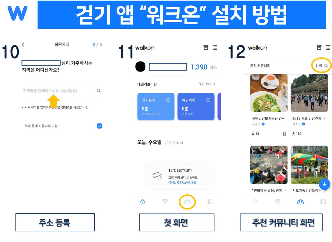 자세한 사항은 지역별 보건소 및 시군구청 홈페이지에서 확인할 수 있는데, 설치해야 하는 어플은 지역마다 모두 같다. 어플에서도 다양한 챌린지와 지역별로 확인이 가능하니 일단 워크온 설치부터 하는 것을 추천한다. 반드시 설치해야 하는 이 어플은 워크온이라는 어플로 설정하는 방법은 다음과 같다.