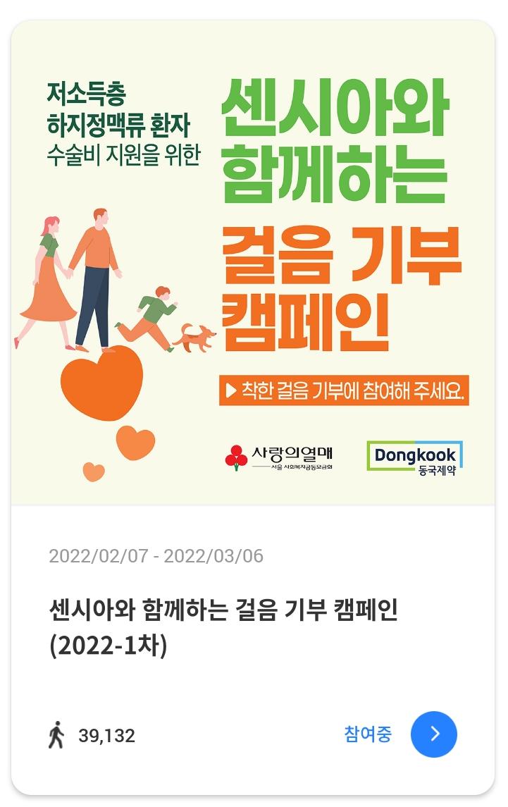 정부기관에서 진행하는 걷기 챌린지 이외에 사회공헌 사업으로 일반 기업도 걷기 미션을 지원하고 있다. 이런 미션은 걷기만 해도 기부가 가능해지고 기부자 명단에도 들어갈 수 있다. 함께 신청한다면 좋은 일도 하고 건강도 좋아지는 1석 2조의 효과를 볼 수 있을 것이라 생각한다.