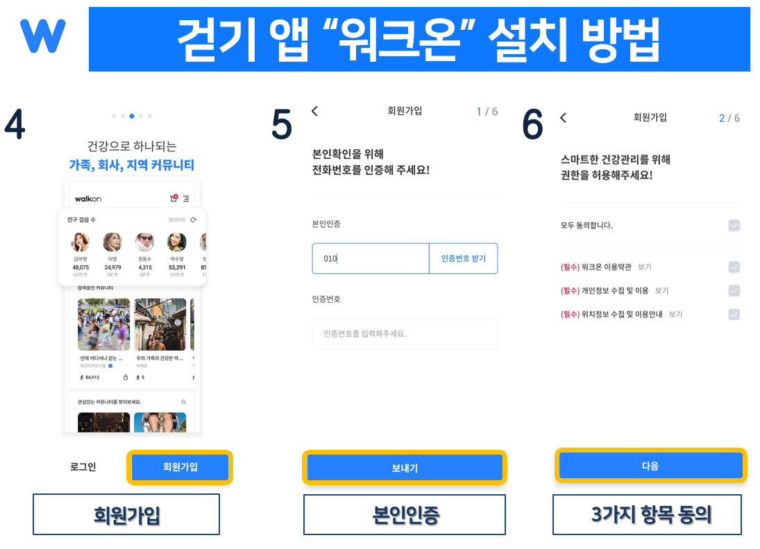 자세한 사항은 지역별 보건소 및 시군구청 홈페이지에서 확인할 수 있는데, 설치해야 하는 어플은 지역마다 모두 같다. 어플에서도 다양한 챌린지와 지역별로 확인이 가능하니 일단 워크온 설치부터 하는 것을 추천한다. 반드시 설치해야 하는 이 어플은 워크온이라는 어플로 설정하는 방법은 다음과 같다.