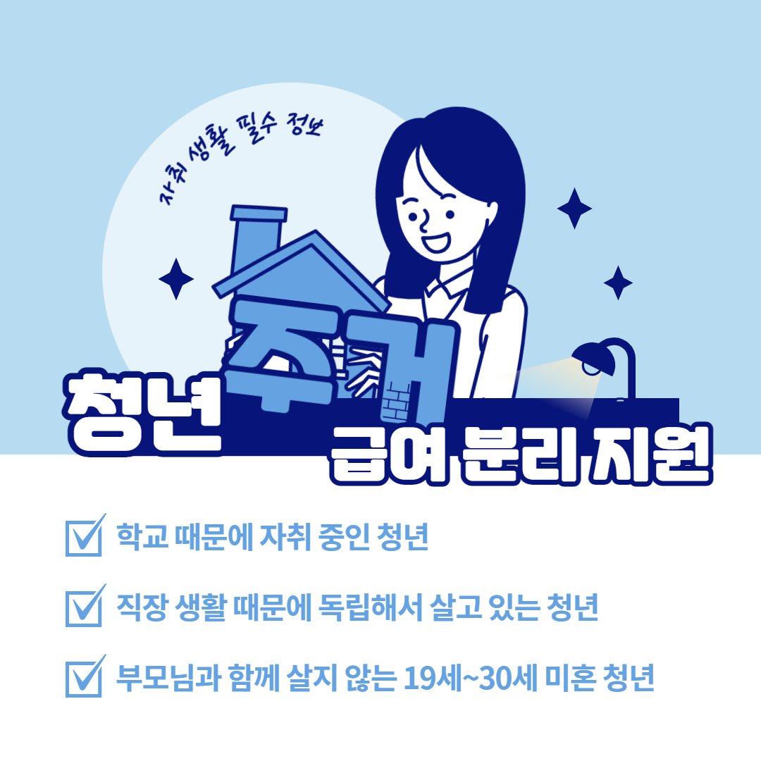 정부에서 시행하는 이 제도는 청년 주거 급여분리 지급으로, 임차급여 또는 수선유지급여를 지급받는 수급자의 만19세~30세 미만의 미혼자녀(이하 “청년가구원”이라 함)가 취학·구직 등의 목적으로 부모와 거주지를 달리하는 경우 지급(청년가구의 인원수 제한은 없음)하는 제도이다. 청년 주거급여 분리지급 대상자로 선발되면 매달 20일에 청년 본인 명의의 계좌로 지원금이 지급된다.
