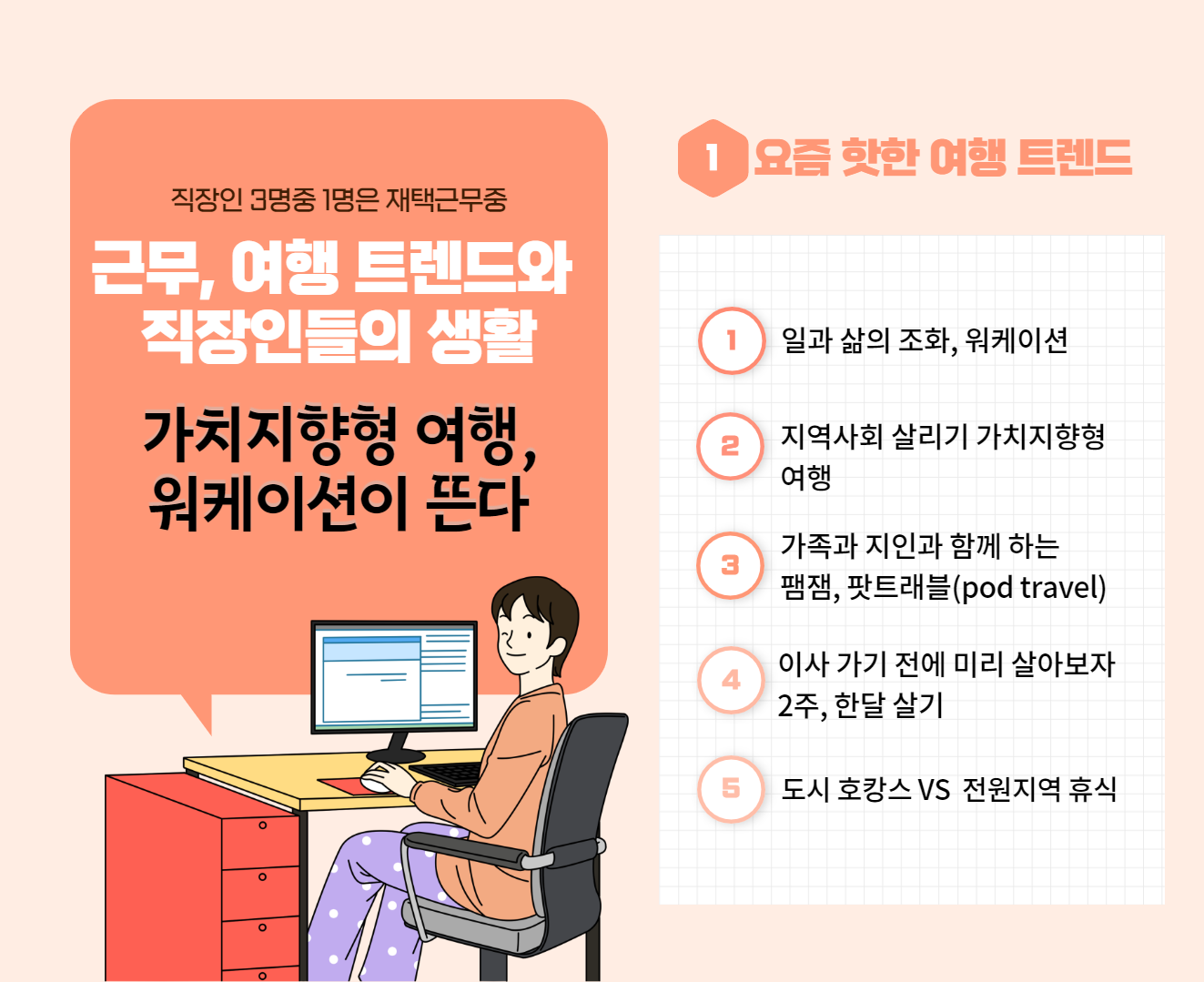 최근 전원 살이 트랜드가 증가하고 있는데, 특히 재택근무나 원격 근무 이후에 워케이션을 즐기기 위해 가는 사람들이 많다. 또한, 이를 통해 앞으로 국내여행을 이전보다 더 자주 다닐 계획을 가진 사람들도 늘어가는 것 같다.