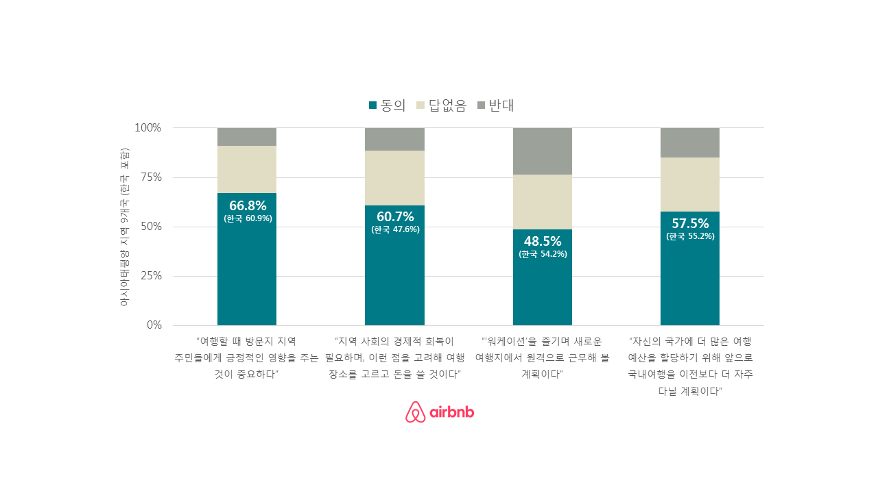 에어비앤비가 한국인 1,010명을 대상으로 진행한 설문조사 결과에 따르면, 한국인 응답자의 61%는 가능하기만 하다면 집이 아닌 다른 곳에서 일하면서 휴가와 같은 분위기를 즐기는 ‘워케이션(work-ation)’을 시도해 볼 의향이 있다고 밝혔다. 낮에는 원격이나 재택으로 근무하고 점심시간이나 퇴근 후에는 가족들과 함께 소고기 바베큐도 즐기면서 낮에는 근무지였다가 퇴근 후에는 여행지로 바뀌는 것이다. 그래서 회사가 아닌 다른 곳에서 일하는 데 있어 가장 매력적인 요소로 51%가 일상과 다른 풍경 속에서 새로운 경험을 할 수 있다는 점이라고 생각 한 것 같다. 그리고 일과 삶의 조화(워크라이프 밸런스)’를 높일 수 있다는 점에 대해서 50%나 긍정적으로 생각하고 있었다. 또한, 74%의 사람들은 국내의 해안가나 지방을 원격근무 하거나 살아볼 만 한 장소로 생각했다.