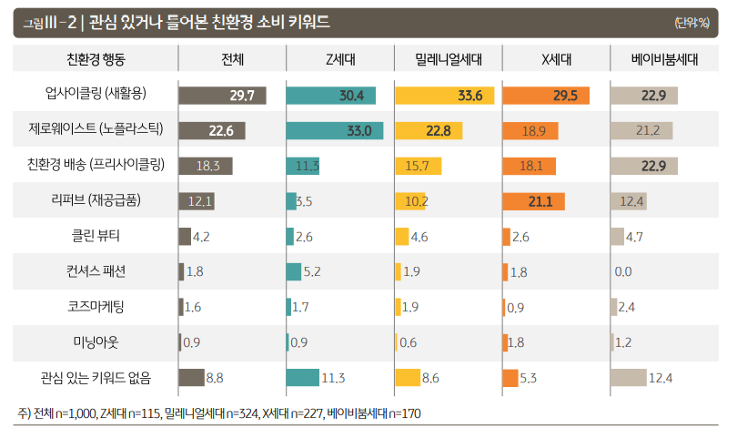 소비자가 가장 관심 있는 친환경 소비 키워드는 업사이클링’(새활용)과 ‘제로웨이스 트’(노플라스틱)가 가장 많았다. 최근 제로웨이스트를 위해 많은 회사에서 비닐봉투 대신 종이봉투를 사용하는 빈도수가 더 증가했다.