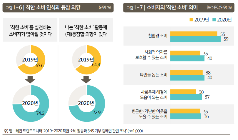 소비자들도 착한 소비, 친환경 소비로 바뀌면서 기업의 ESG 활동이 소비자의 구매 행위에도 영향을 주는 것으로 나타났다. 최근 친환경, 비건 등 환경적인 분야의 상품들도 많아지면서 이전보다 더 친환경 소비에 대한 관심이 많아졌기 때문인 것 같다.
